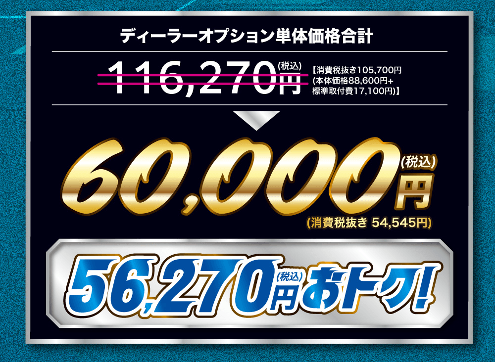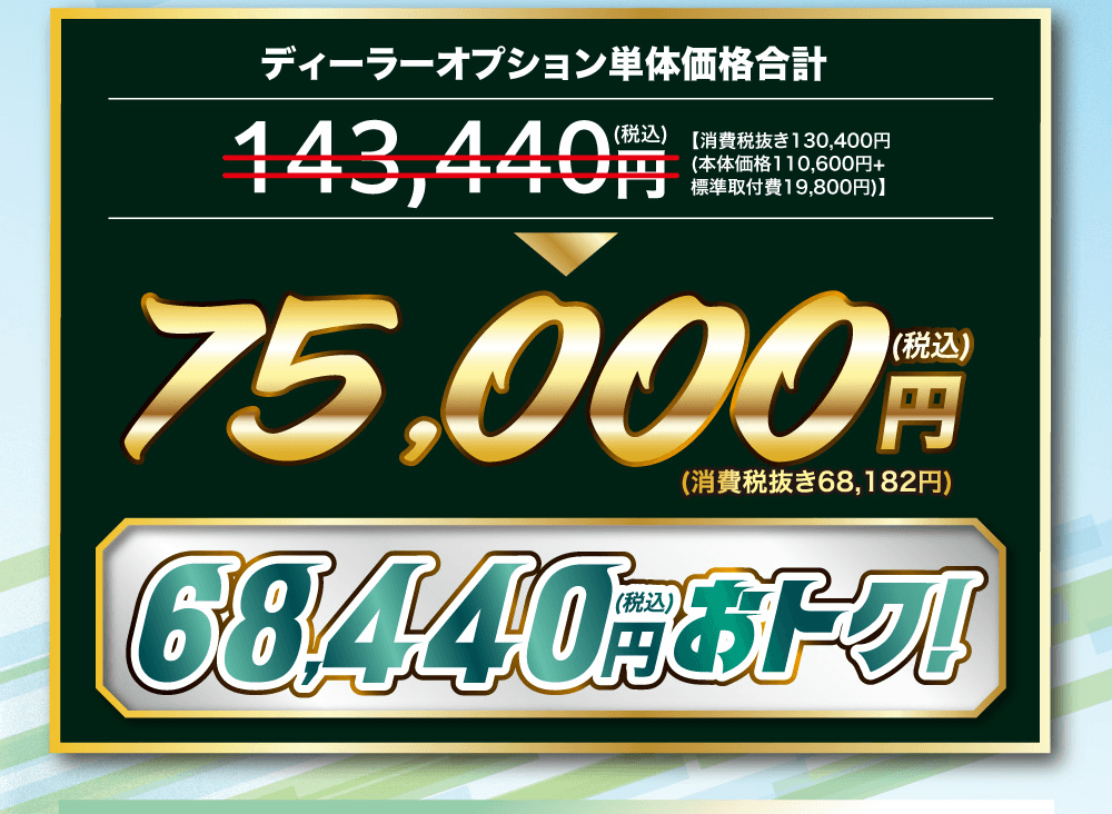 オプション+ナビ(A+B)合計: 通常価格 214,720円(税込)特別価格:170,000円(税込) (44,720円おトク!)車両本体価格: メーカー希望小売価格 1,025,200円(税込)特別ワンプライス:992,200円(税込) (33,000円おトク!)