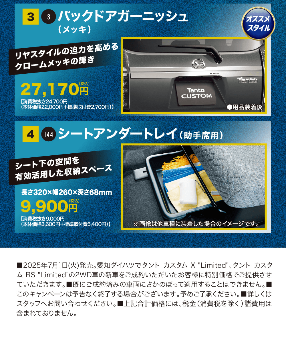 愛知県特別限定車 タフト 「スペシャル愛」期間: 2026年4月1日(水)~6月30日(火)対象車種: タフトの全グレードかつメーカーオプションの9インチスマホ連携ディスプレイオーディオ付車