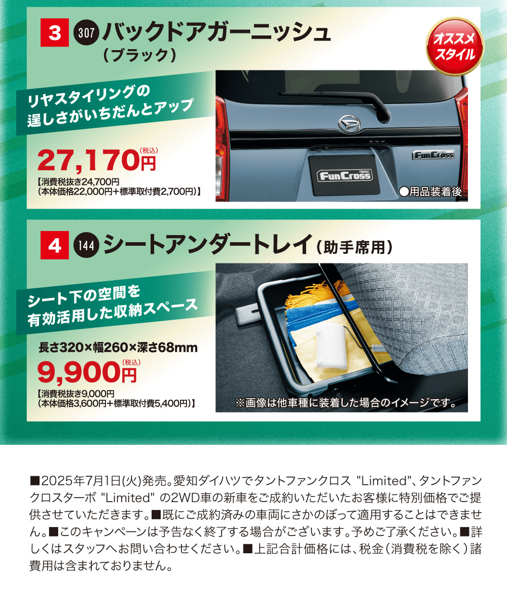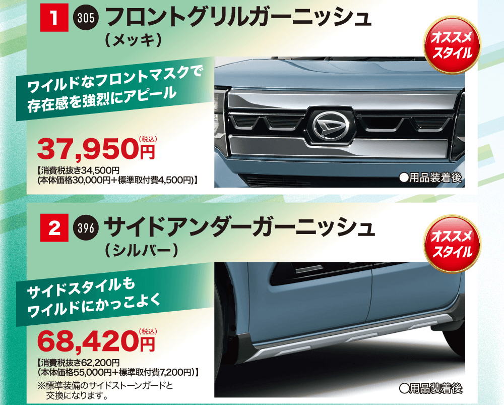 オプションセット(A+B+C)合計: 通常価格 133,826円(税込)特別価格:56,364円(税込) (77,462円おトク!)車両本体価格(タフト X): メーカー希望小売価格 1,419,000円(税込)特別ワンプライス:1,386,000円(税込) (33,000円おトク!)