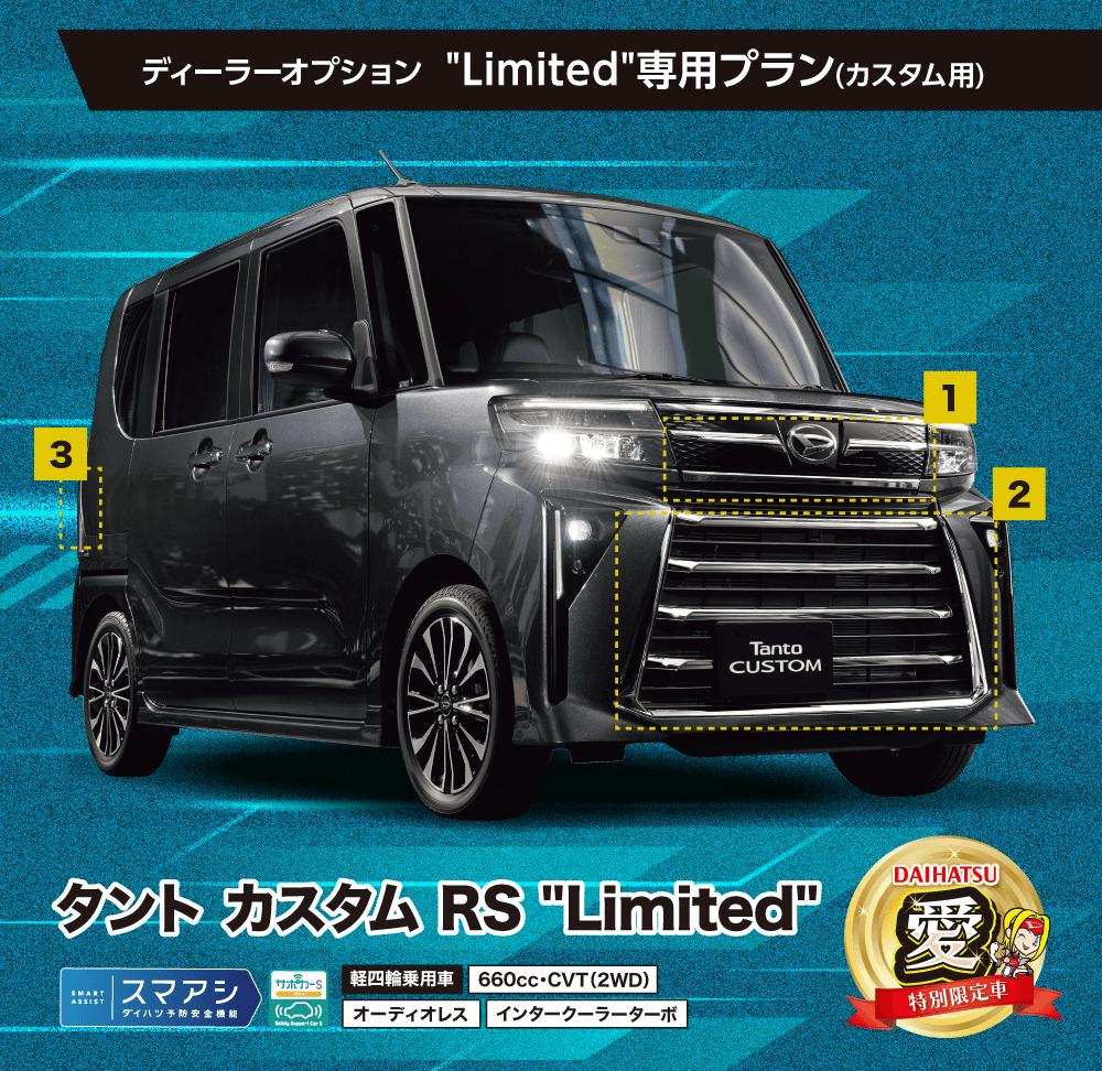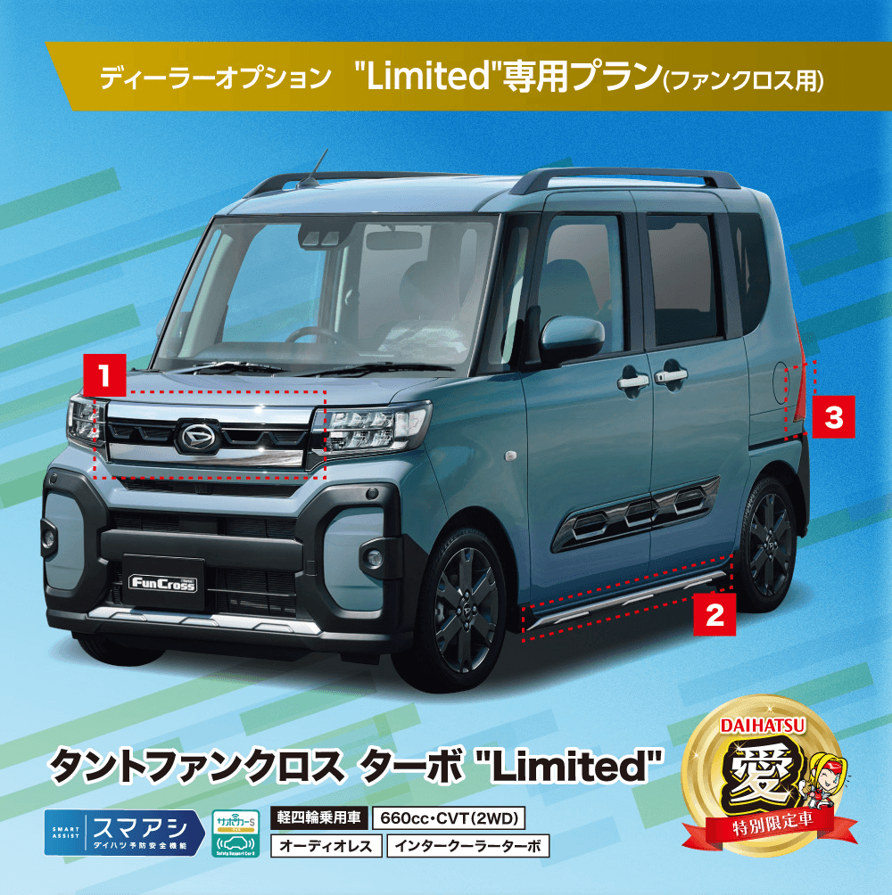 愛知県特別限定車 タフト 「スペシャル愛」期間: 2026年4月1日(水)~6月30日(火)対象車種: タフトの全グレードかつメーカーオプションの9インチスマホ連携ディスプレイオーディオ付車