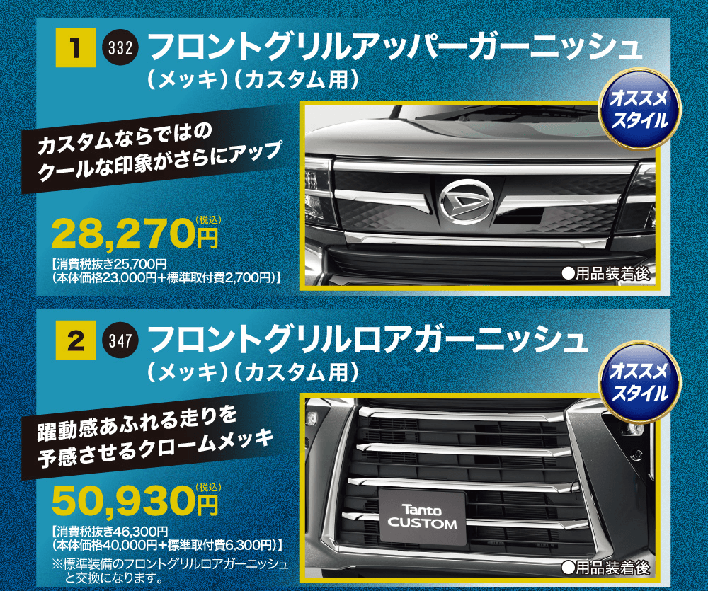 ダイハツ5万円分用品プレゼントキャンペーン期間中にムーヴ、タント タントカスタム タント ファンクロスの新車をご成約いただいたお客様にダイハツの 純正用品50,000円分(税込55,000円分)を プレゼントさせていただきます。4月1日[水] 6月30日[火]※本キャンペーンは予告なく終了する場合があります。対象ムーヴ(ムーヴキャンバスは対象外) タント●タントカスタム・タント ファンクロス※福祉車両も含みます。 ※愛知県特別限定車のパックオプションには使用できません。