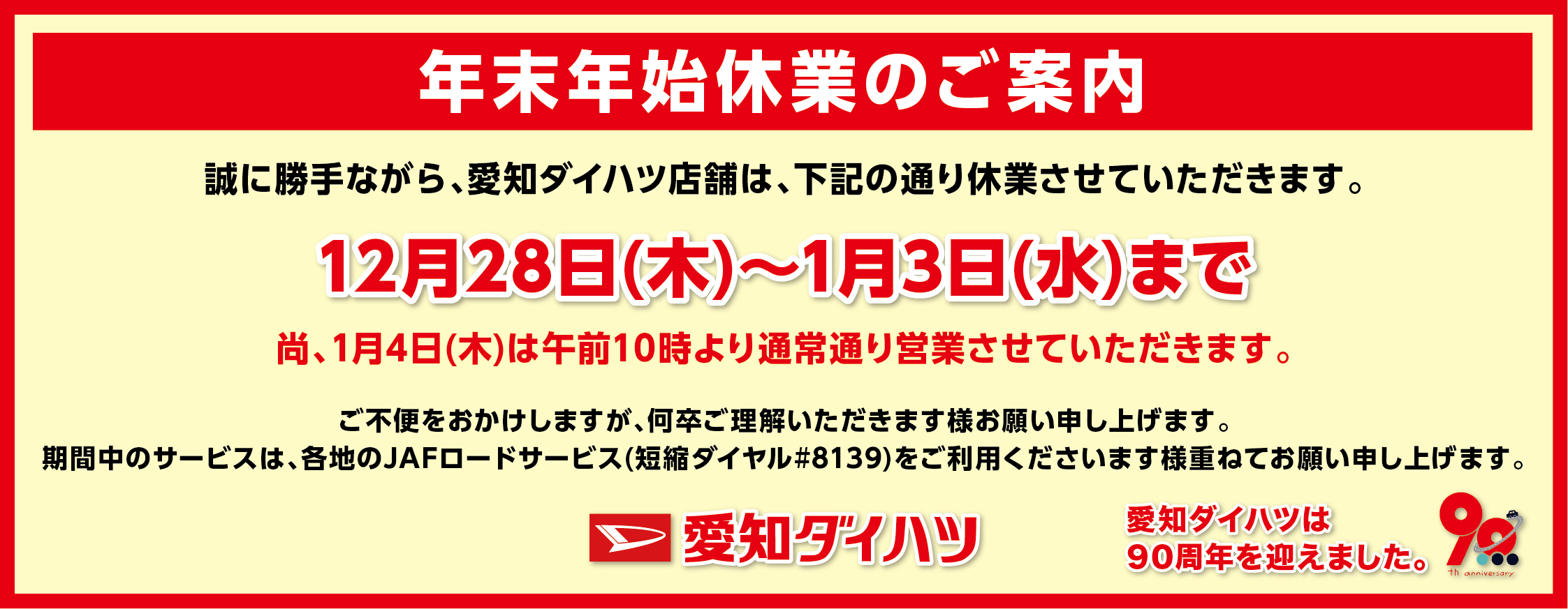 愛知ダイハツ店舗は、12月28日(木)より1月3日(水)まで休業させていただきます。